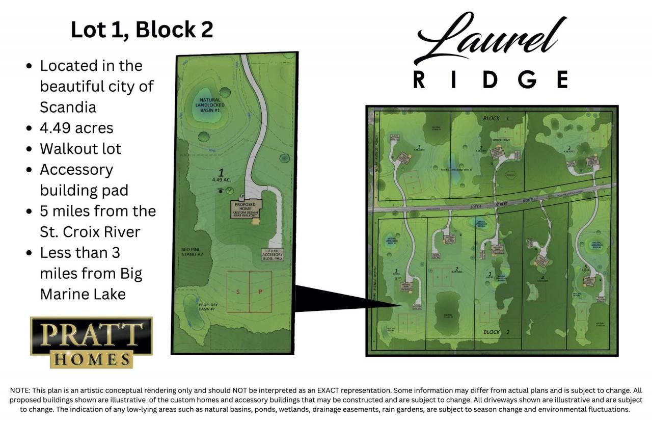We are excited to introduce a new community in historic Scandia - Laurel Ridge! This unique neighborhood features eight beautifully positioned 4+ acre walkout sites, designed to foster a true sense of community and provide a peaceful oasis for its residents. Laurel Ridge captures the charm of rural living while maintaining close proximity to the town of Scandia. Each site includes a designated building pad for your dream home, as well as space for a future accessory building. This exclusive neighborhood will be developed by Pratt Homes, a trusted custom quality home builder. Don't miss this rare opportunity! Contact us today to schedule a tour and explore the possibilities of your new home at Laurel Ridge.