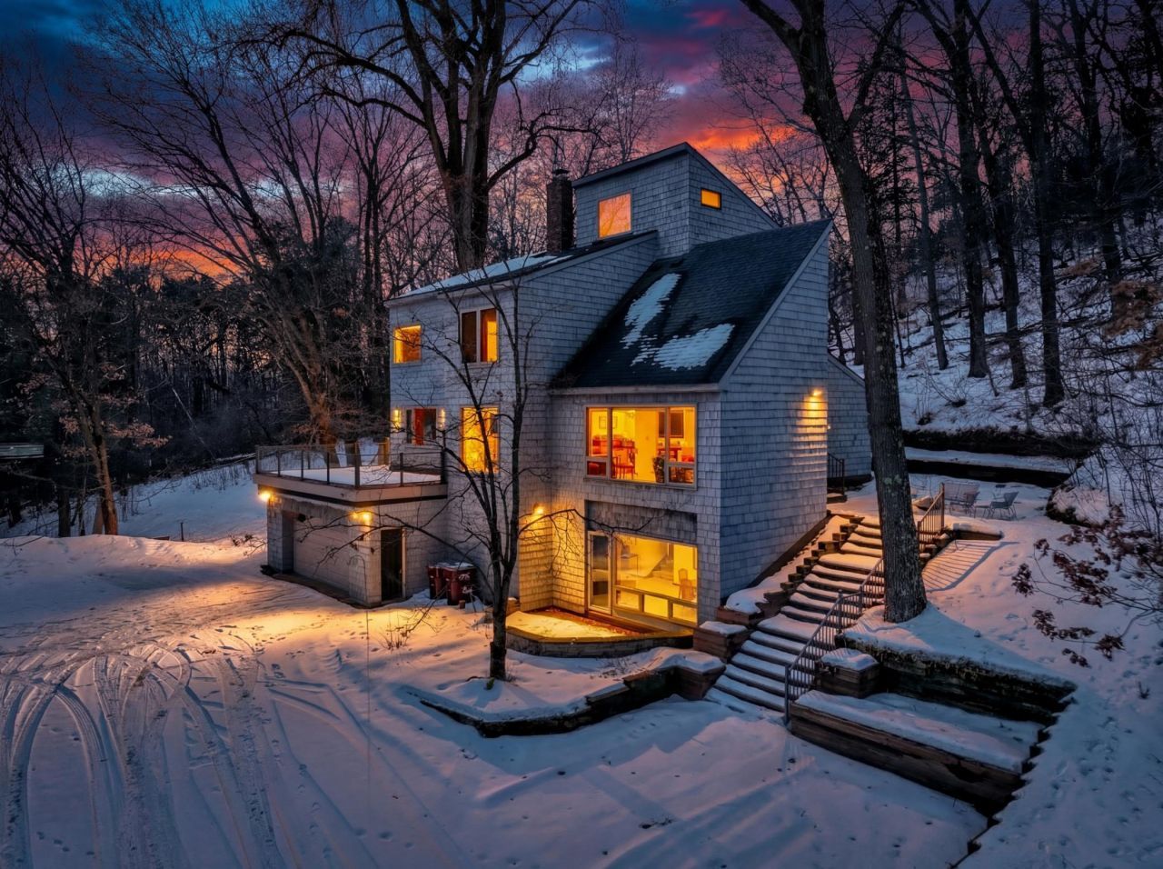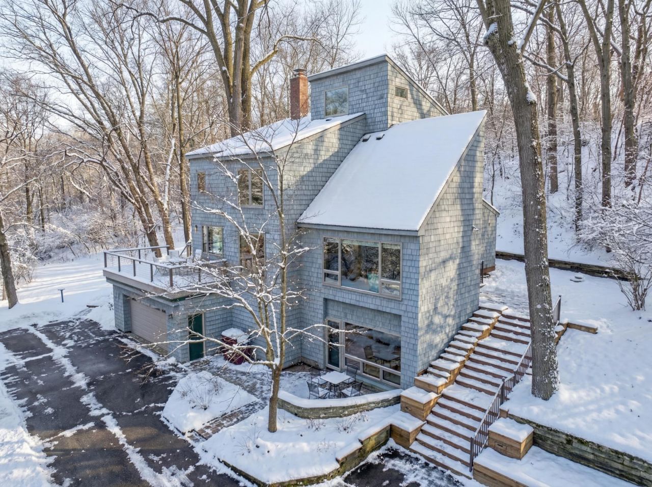 Architecturally striking and thoughtfully updated, this extraordinary residence is designed to capture the beauty of its wooded surroundings from every angle. Expansive windows frame panoramic treetop views, creating a seamless connection between indoor living and nature. Energy-efficient Norwegian H windows enhance both performance and design, bringing in abundant natural light while elevating the home's modern aesthetic.Extensive updates inside and out highlight clean lines, contemporary finishes, and functional living spaces. Expansive glass-rail decks extend the living area outdoors?ideal for entertaining, outdoor cooking, or quiet evenings immersed in the serene setting.The kitchen is a true centerpiece?light-filled and beautifully appointed with generous prep space, premium appliances, an additional prep sink, and exceptional custom storage for cookware and provisions. The open dining area flows effortlessly to the deck, making gatherings easy and inviting. A separate formal dining room offers a warm and intimate setting for holidays and special occasions.Upstairs, spacious bedrooms provide comfort and privacy, including a stunning owner's suite with panoramic views and a spa-inspired bath featuring dramatic corner windows overlooking the trees. The uppermost level offers a lofted library and private guest suite with its own bath?an ideal retreat for visitors, creative space, or quiet study.The walkout lower level offers flexibility with a large family room that can also function beautifully as a home office, with direct driveway access?perfect for today's work-from-home lifestyle.The professionally landscaped grounds are filled with perennials, with a staircase leading to the area where there was a large vegetable garden, which is rich with possibilities.Located on sought-after Afton Hills Drive S, just above the charming village of Afton, this home places you minutes from the St. Croix River, local shops, restaurants, year-round festivals, nearby state park trails, and Afton Alps ski area. Here, architectural beauty meets an active, nature-centered lifestyle.A truly distinctive home in an unforgettable setting.