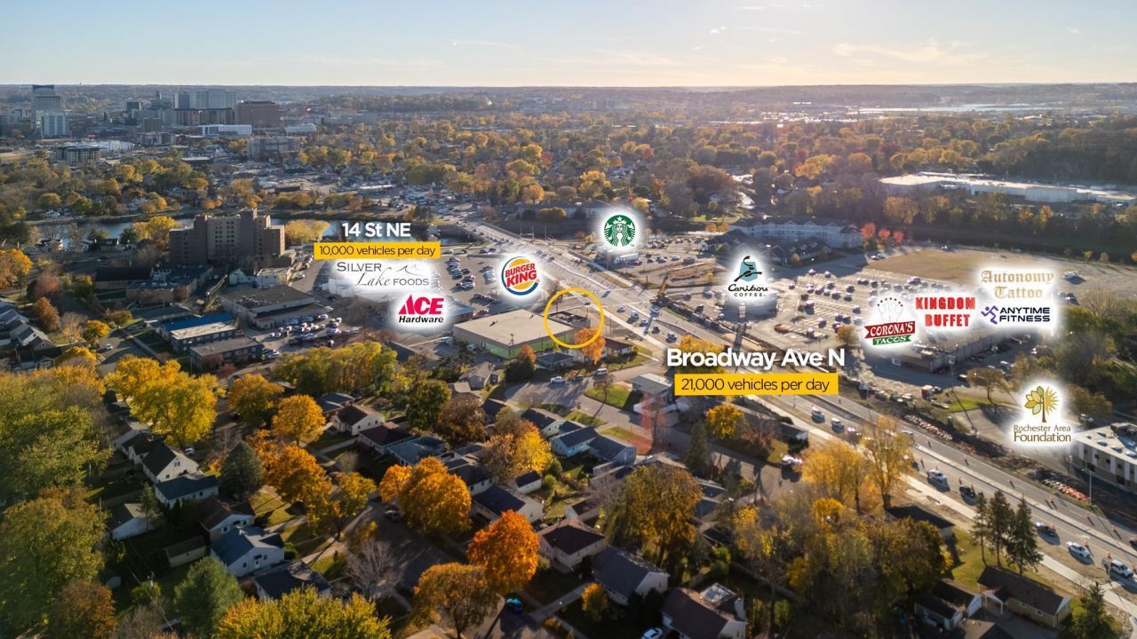 Rare high-visibility opportunity on North Broadway! This iconic 1,292 sq. ft. standalone commercial building is now white-boxed and ready for your custom build-out. Perfectly positioned on a high-traffic corridor with over 21,000 cars passing daily, this location offers unparalleled brand exposure for retail, professional office, or service-based businesses.The property features a prominent pylon sign for maximum street-level marketing and convenient front-door parking for clients and staff. Located just north of Downtown Rochester and the Mayo Clinic district, this site combines the autonomy of a free-standing building with the accessibility of a central urban hub. Skip the demolition and start fresh in a clean, open space designed to bring your business vision to life today!