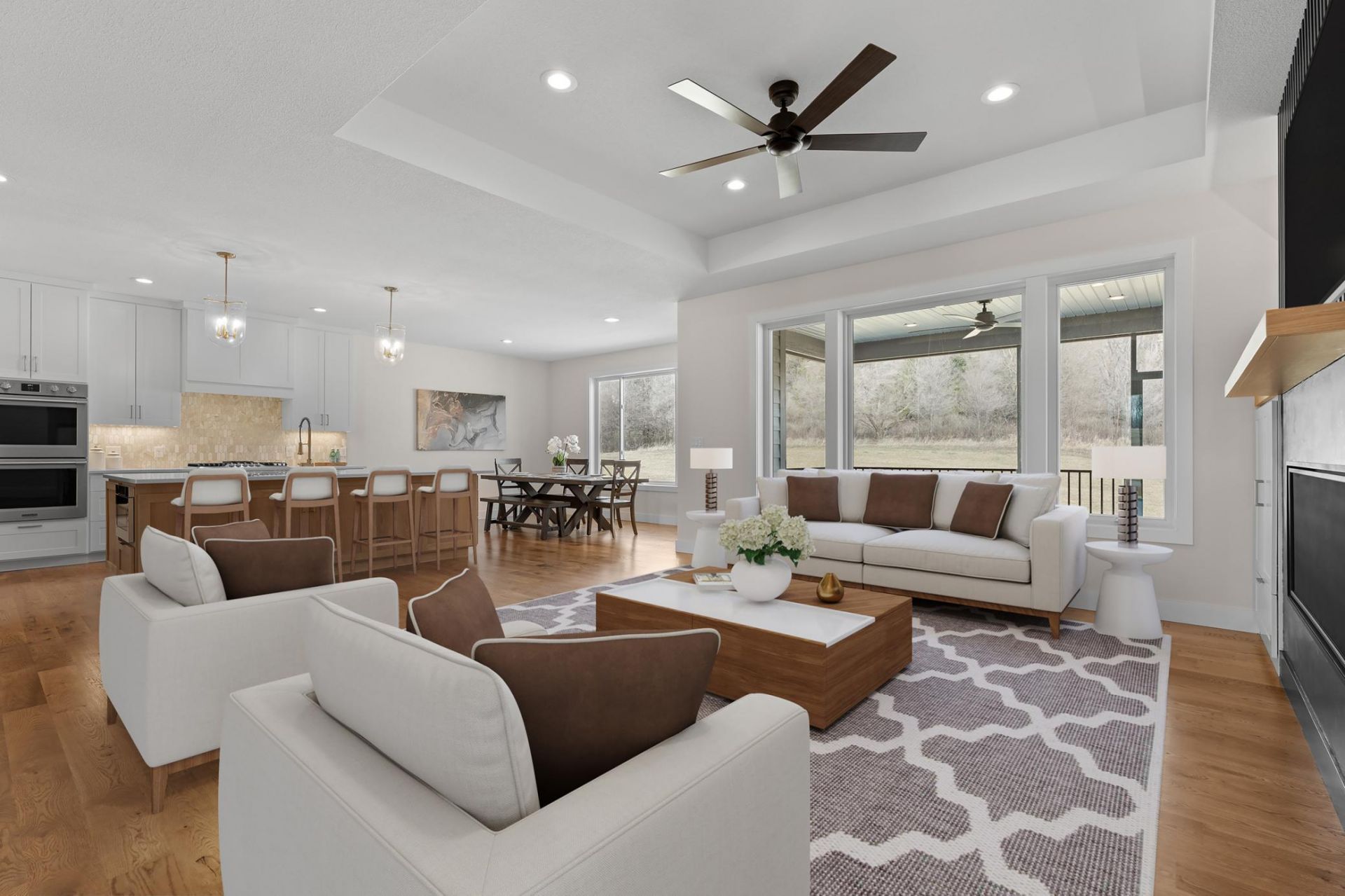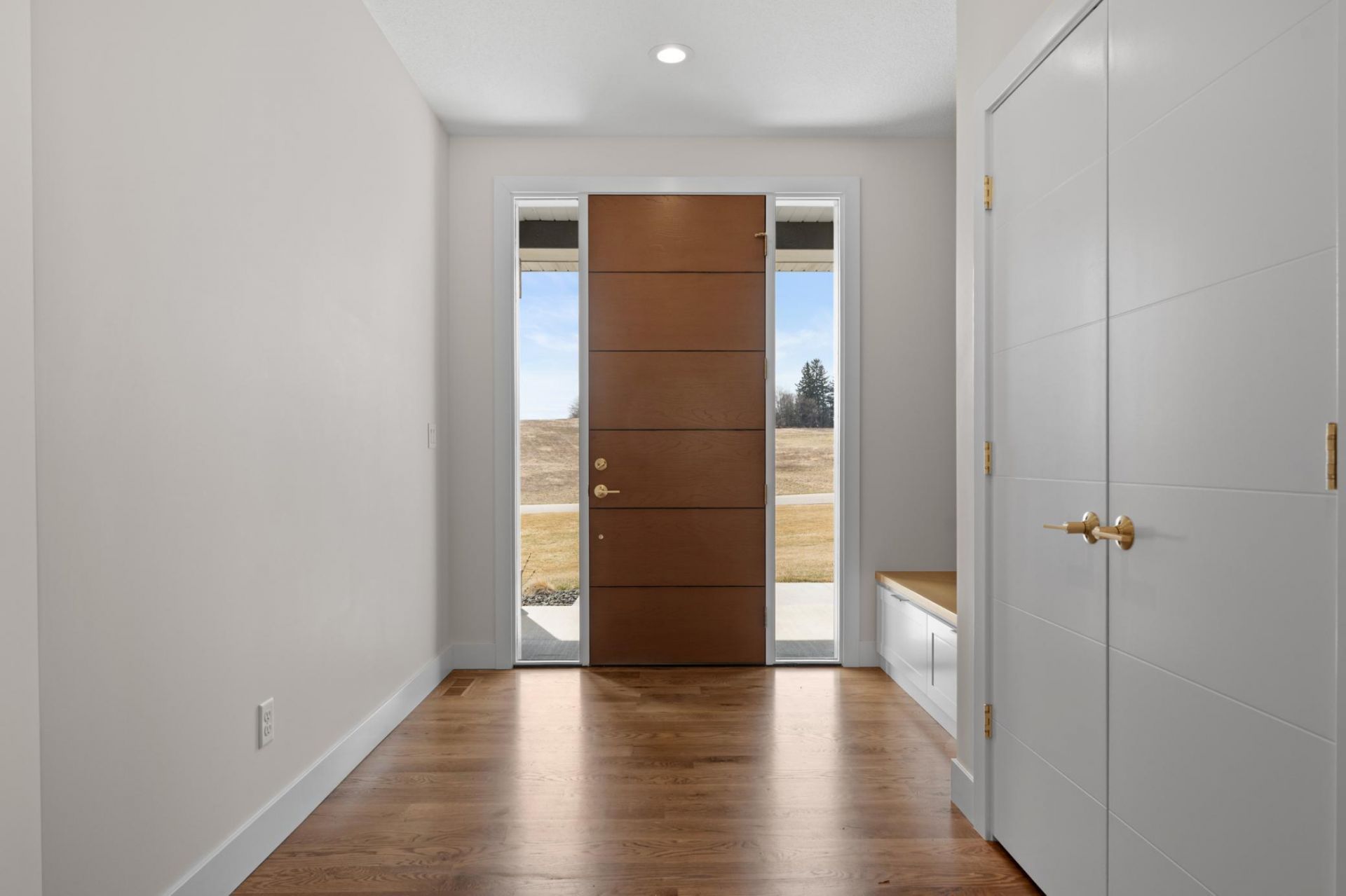 Situated on a picturesque 2-acre lot, this home combines sophisticated style with unparalleled craftsmanship. From the moment you step inside, you'll be captivated by the rich oak hardwood floors that flow seamlessly throughout the main floor, setting the tone for elegance and warmth. As in most homes, the heart of this home is the gourmet kitchen, with an oversized island, sleek quartz countertops and custom cabinetry (which is also in the hidden pantry). This space is built for both functionality and beauty. The open-concept design continues into the living area, where the main focus is a stunning fireplace surrounded by European-style plaster and custom woodwork, creating a bold statement piece that blends seamlessly with the modern aesthetic. The lower level is an entertainer's dream, featuring a large family room designed for gatherings of all sizes. A full wet bar with custom cabinetry, full size refrigerator and offers the perfect setting to complement functionality of the lower level. Step outside to your own private oasis, where a cement patio with a built-in firepit awaits. This outdoor space is perfect for relaxing or entertaining, offering a seamless transition from the interior. Enjoy Minnesota evenings on the screened-in deck, providing a peaceful retreat surrounded by nature. With every detail carefully considered, this contemporary home offers the ultimate in modern living, designed to meet the needs of the most discerning homeowner. Don't miss the opportunity to make this breathtaking property your own.