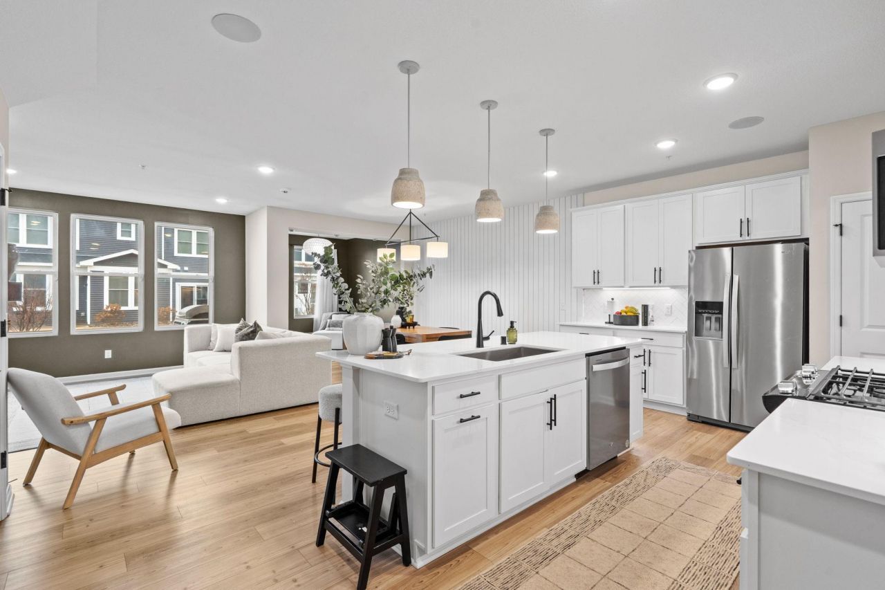 (Showings start Saturday 3/21) Welcome home to this beautiful, light-filled townhome with stylish finishes in a desirable corner unit. As a former model home, this two-level floorplan offers thoughtful upgrades and smart-home features throughout. The main level features fresh paint, upgraded light fixtures, and a warm and inviting gas fireplace. The kitchen is designed to impress with Silestone quartz countertops, subway tile backsplash, under-cabinet lighting, upgraded faucets, and newer stainless steel smart Whirlpool appliances. The dining area features wood paneling that adds character and charm. Enjoy modern convenience with a Sonos sound system wired throughout the home and a Nest smart thermostat. A versatile office/flex space on the main level provides the perfect spot for working from home or a cozy sunroom. Just off the garage entry, you'll find a built-in boot bench for extra storage and convenience. Upstairs offers three bedrooms on one level, including a spacious primary suite with upgraded glass shower doors, a double-sink vanity, and large walk-in closet. You'll love the convenient upper-level laundry and the custom closet systems in each bedroom. Convenient location with quick access to 35W, shopping, restaurants, and near tons of beautiful walking trails!