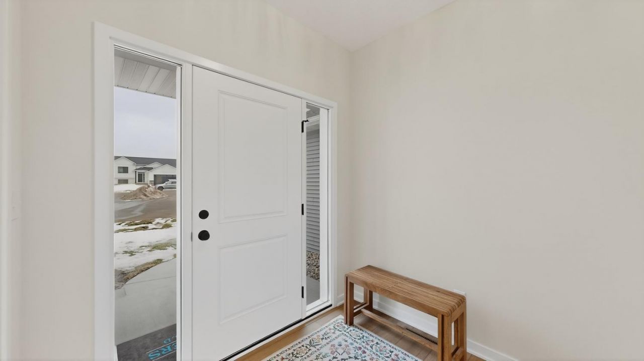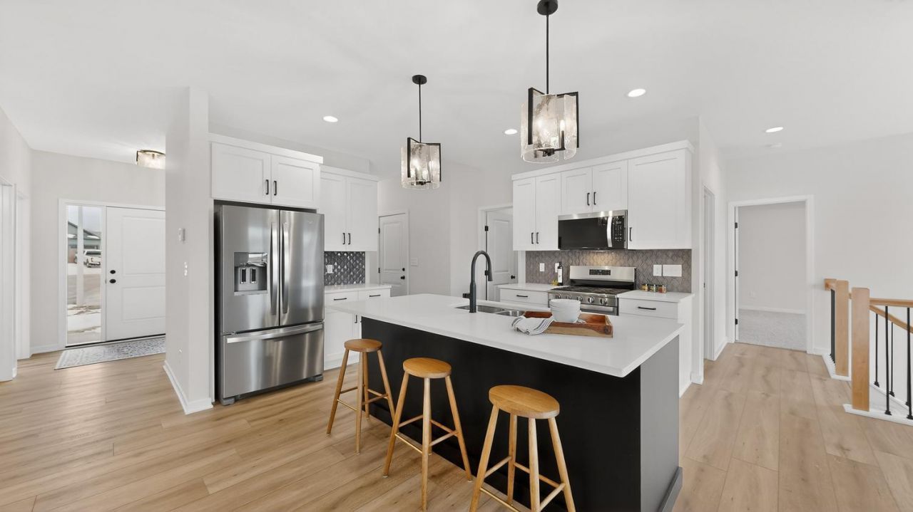 This home offers a bright, open-concept main floor where the kitchen, dining room, and living room all connect effortlessly?perfect for hosting, gathering, or keeping everyone together in one inviting space. The kitchen features beautiful custom cabinets, quartz countertops, a tile backsplash, and a large island ideal for meal prep and conversations. The primary suite includes a fully tiled walk-in shower for a spa-like feel, with stylish finishes throughout the bathrooms. You'll love the mix of LVP flooring in high-traffic spaces, tile in the laundry and mudroom, and soft carpet in the bedrooms. High quality windows bring in great natural light, and the stone fireplace on the main level adds a cozy touch. The home is equipped with efficient heating and cooling, modern black fixtures, LED lighting, a sprinkler system, final grade and sod, and a finished, insulated, heated garage with a floor drain?creating a comfortable, polished, move-in-ready living experience.