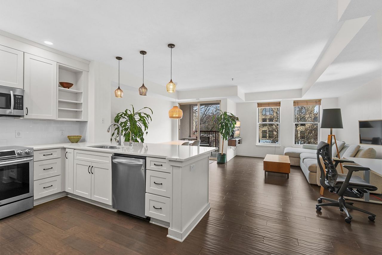 This one bedroom + one bath River Station condo is located in the highly desirable North Loop. The kitchen features beautiful granite counter tops with white cabinets & stainless steel appliances. The condo also features hardwood floors, large windows providing an abundance of natural light and in-unit laundry. Located within easy walking distance to all the North Loop has to offer from shops, restaurants, Target Field, the riverfront, and transit-this location can't be beat! Well-managed association with lush courtyards and pet-friendly policies. HOA fee includes internet and cable. Parking stall #15, storage locker #42B on the 4th floor.