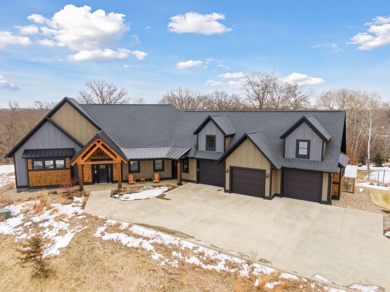 Stunning custom home set on 1.6 wooded acres, showcasing high-end and reclaimed finishes that create a refined rustic-modern aesthetic. The gorgeous open-concept kitchen features a center island, stainless steel appliances, custom wood beams, a reclaimed brick accent wall, and a double-sided fireplace. The adjoining dining area is thoughtfully designed with a hand-hewn oak bench, barn-wood wall paneling, and a walk-in pantry. The living room offers vaulted ceilings and breathtaking wooded views, while the three-season porch provides a serene, protected space to enjoy the outdoors. An expansive mudroom with built-in storage leads to a deluxe laundry room and an attached 3-car garage. The main-level primary suite includes a box-vault ceiling, a luxurious ensuite bath, and an exceptional walk-in closet. The upper level provides flexible space suitable for a bedroom, playroom, studio, office, or a variety of needs. The lower level is designed for entertaining, featuring a spacious family room, reading nook, full kitchen, cherry-wood bar top, and a garage door opening to an outdoor bar and patio. Additional lower-level amenities include heated flooring, bedrooms, an exercise room, a full bath, and a second laundry area. A remarkable greenhouse connects to a heated workshop with a garage door leading to a fully fenced garden. The breathtaking 1.6-acre setting, surrounded by mature trees and unmatched privacy, offers an exceptional retreat that balances luxury, craftsmanship, and nature at its finest.