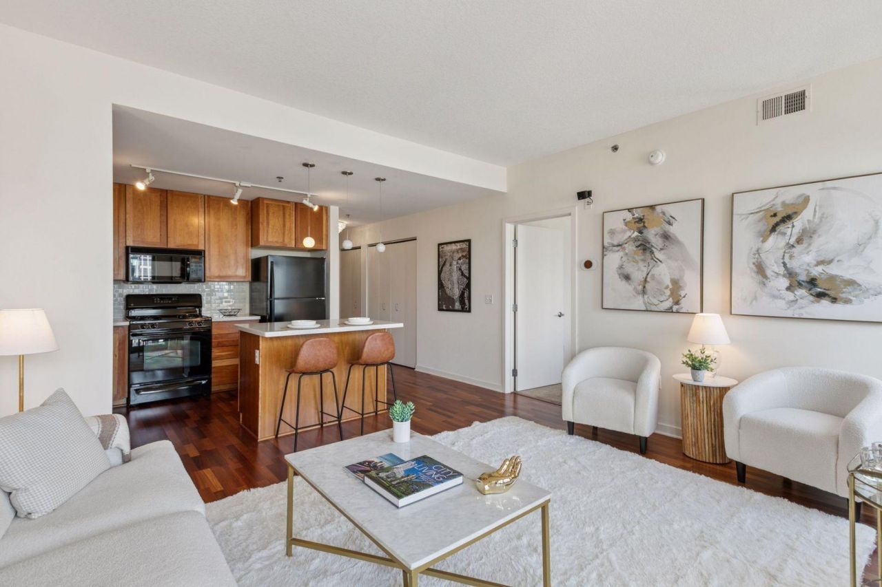 Seventh-floor sophistication meets city living in this two-bedroom, two-bathroom condo with sweeping skyline views. Hardwood floors flow throughout an open layout with floor-to-ceiling windows and a private balcony, perfect for morning coffee or evening cocktails. The updated kitchen impresses with white quartz countertops, gas cooktop, and stainless appliances. The primary suite features a walk-in closet and modern en-suite bath, while the second bedroom offers flexibility for guests or a home office. In-unit laundry adds convenience. Building amenities elevate daily life: fitness center, hot tub, party room, and a rare sixth-floor rooftop park with grass, trees, fireplaces, grills, and captivating views. Pet-friendly with two walk areas, this residence blends modern comfort with urban lifestyle. Ideally located near dining, shopping, culture, and transit, it's move-in ready and perfectly tailored for those seeking elegance, convenience, and the vibrancy of city living. Underground heated parking included as well as 24 hr lobby desk coverage.